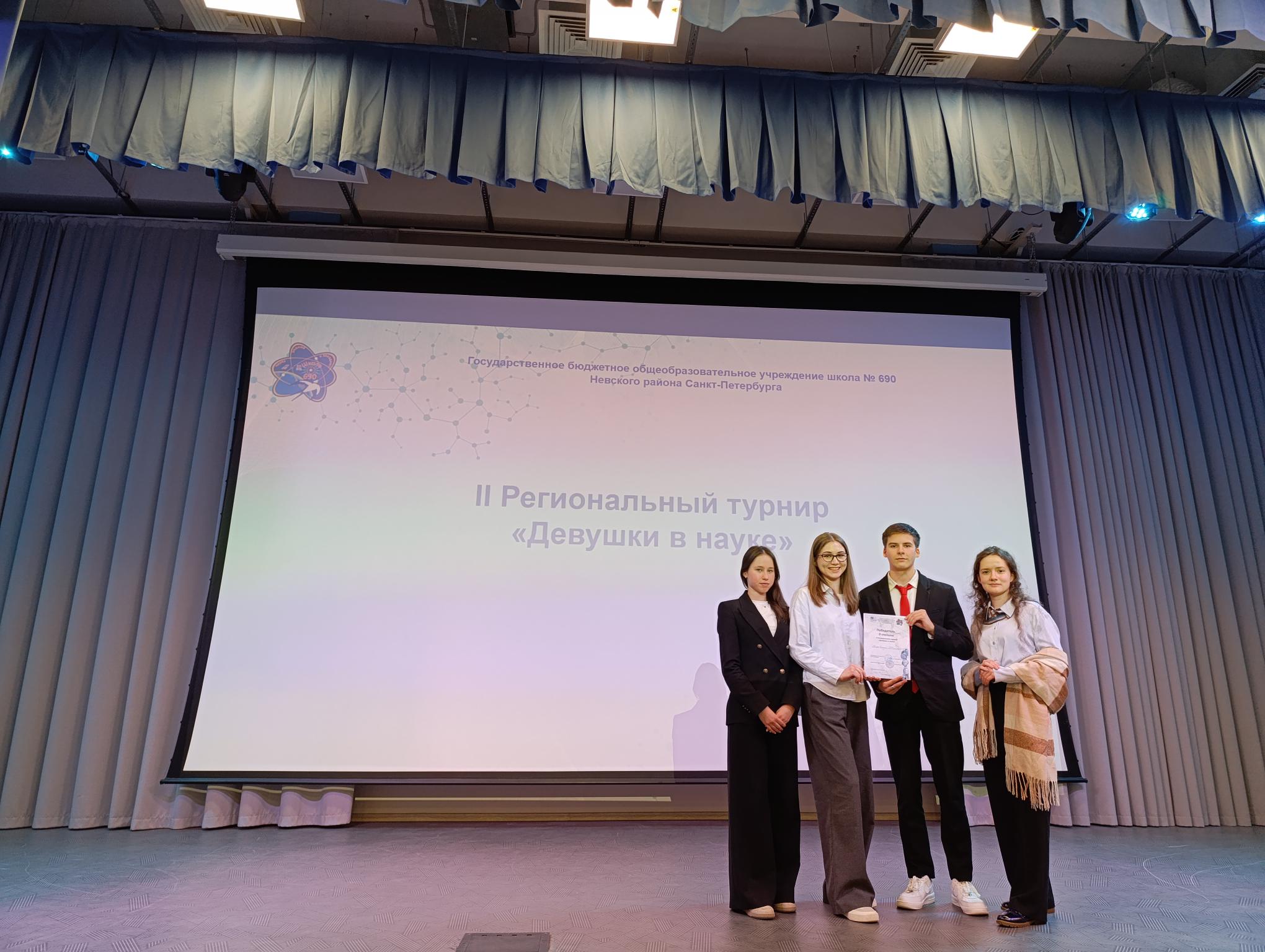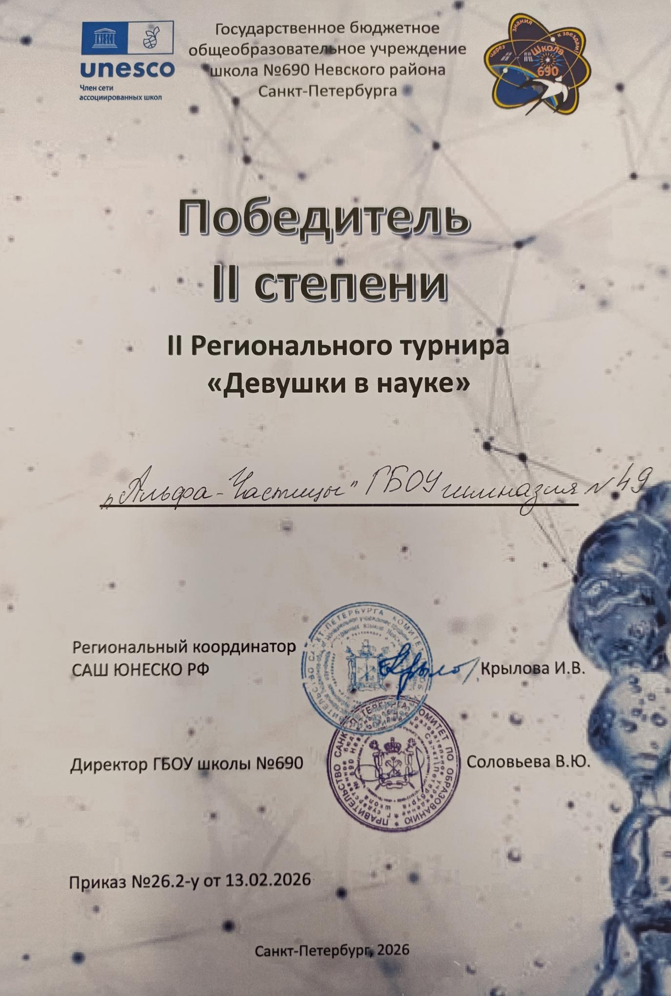 Команда «Альфа-Частицы» ГБОУ гимназии №49 Приморского района Санкт-Петербурга стала победителем II степени во II Региональном турнире "Девушки в науке", организованном ГБОУ школой №690 Невского района Санкт-Петербурга.