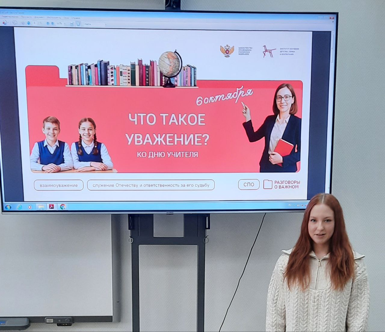 6 октября в нашем колледже в рамках всероссийского проекта состоялось очередное занятие «Разговоры о важном». Тема этой недели была посвящена фундаментальным ценностям, которые определяют гармоничное развитие личности и общества: уважению, ответственности и признанию важности учительского труда.