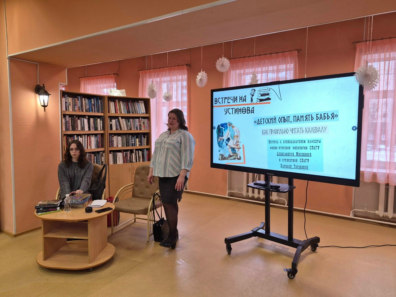 21 января в Рыбацкой библиотеке состоялась встреча с преподавателем кафедры финно-угорской филологии СПбГУ Александрой Николаевной Мизоновой, и студенткой СПбГУ Дариной Тороповой. Наши гости рассказали старшеклассникам из школы № 574 о карело-финском эпосе «Калевала».