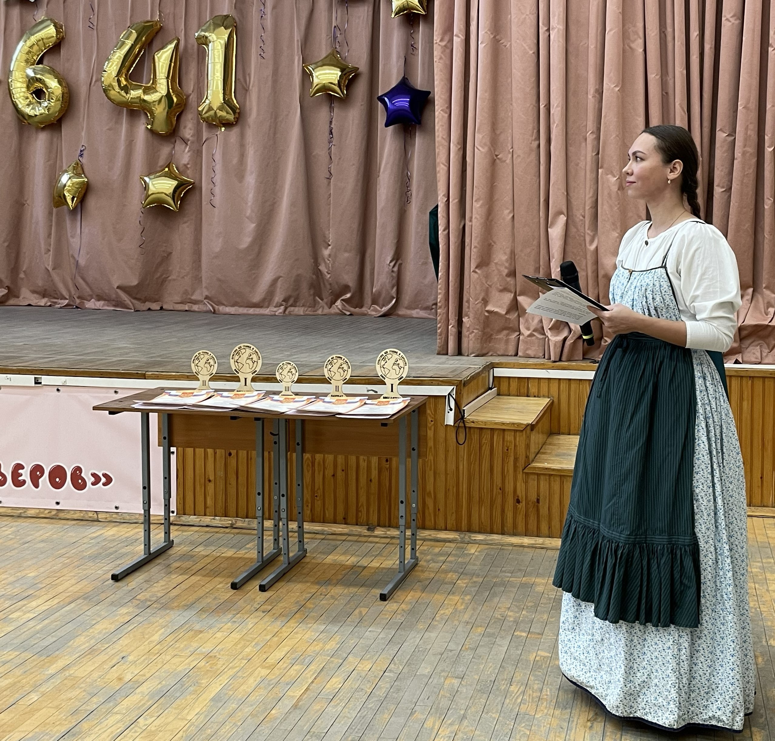 - В холле второго этажа, перед входом в актовый зал, участники конкурса отвечали на вопросы о национальностях, представленных на плакатах отборочного тура, проводимого среди обучающихся 5-8 классов ГБОУ школы № 641 Санкт-Петербурга. Интерактив организовала и провела Михайлова Дарья, юный мастер музея-мастерской «Школа ремёсел» , участница ансамбля национального танца «Заонежская бесёда» и театра моды «Славутница» .
