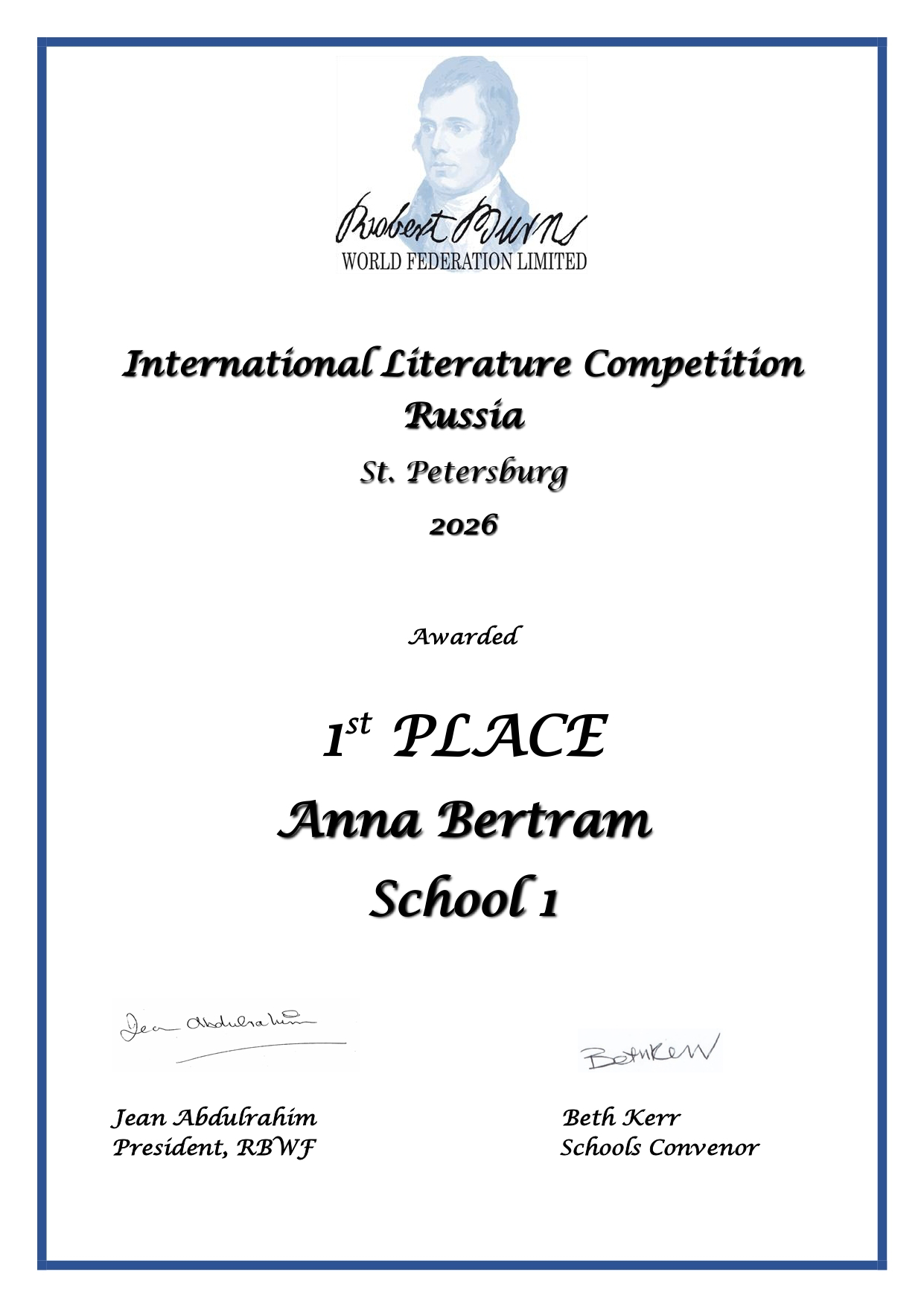 Поздравляем нашу талантливую ученицу 11 «А» класса, Бертрам Анну, с первым местом в престижном мировом конкурсе эссе, посвящённом жизни и творчеству знаменитого шотландского поэта Роберта Бёрнса!