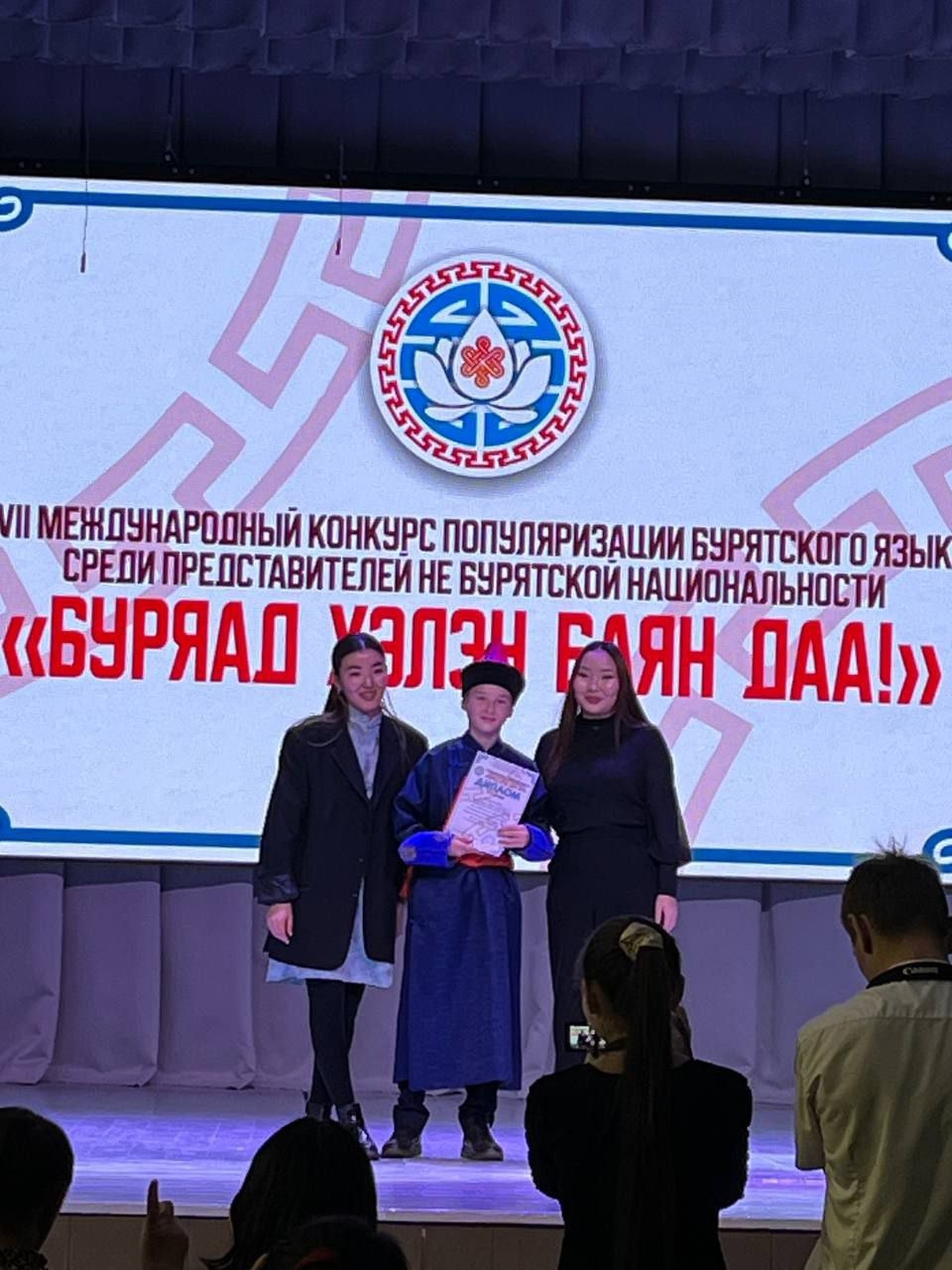 В межрегиональном конкурсе «Буряад хэлэн баян даа!» также приняли участие учащиеся нашей школы и заняли призовые места: Иванов Дмитрий, ученик 10 "в" класса -2 место, Доржеев Дементий, ученик 6"б" класса - 2 место (руководиитель Мункуева Мира Баировна, учитель бурятского языка, Бальчунас Даниил, ученик 10 "а" класса - 3 место (руководитель Лубсанова Цыбигма Владимировна).
