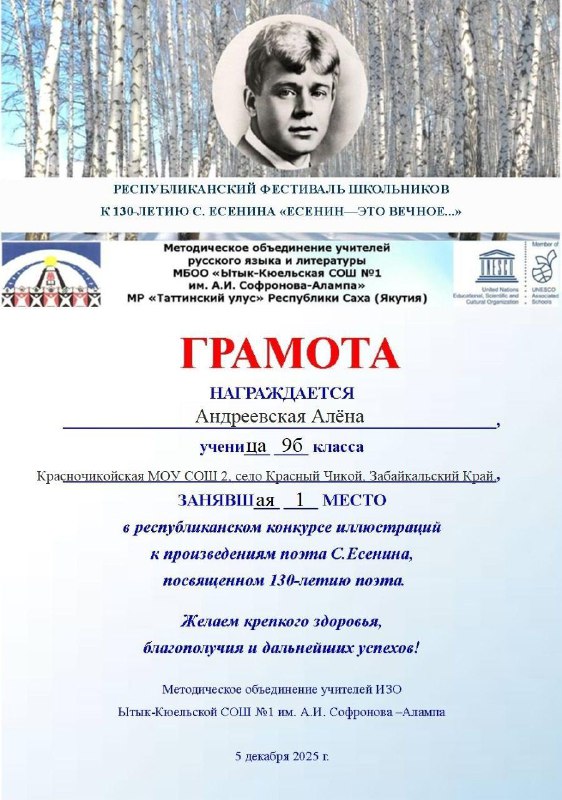 Две ученицы нашей школы Андреевская Алёна и Деревцова Мария принимали участие в республиканском конкурсе иллюстраций к произведениям поэта С. Есенина посвященном 130-летию поэта.