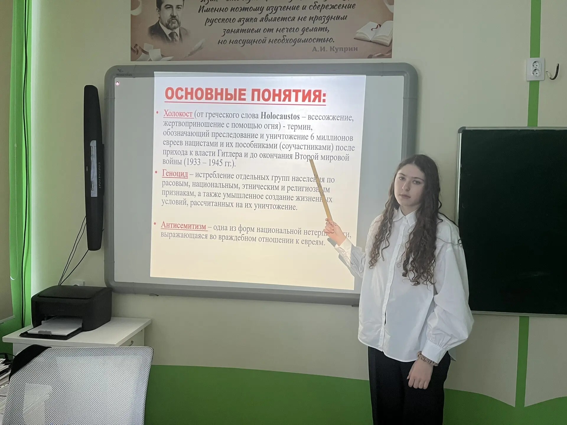 Ребята узнали о таких понятиях, как «Холокост», «Геноцид» и «Антисемитизм». Они с замиранием сердца слушали о страшных преследованиях и уничтожении жизней, о деятельности концлагерей смерти. На слайдах презентации были показаны ужасные фотографии лагеря Аушвиц, созданного в 1940 году.