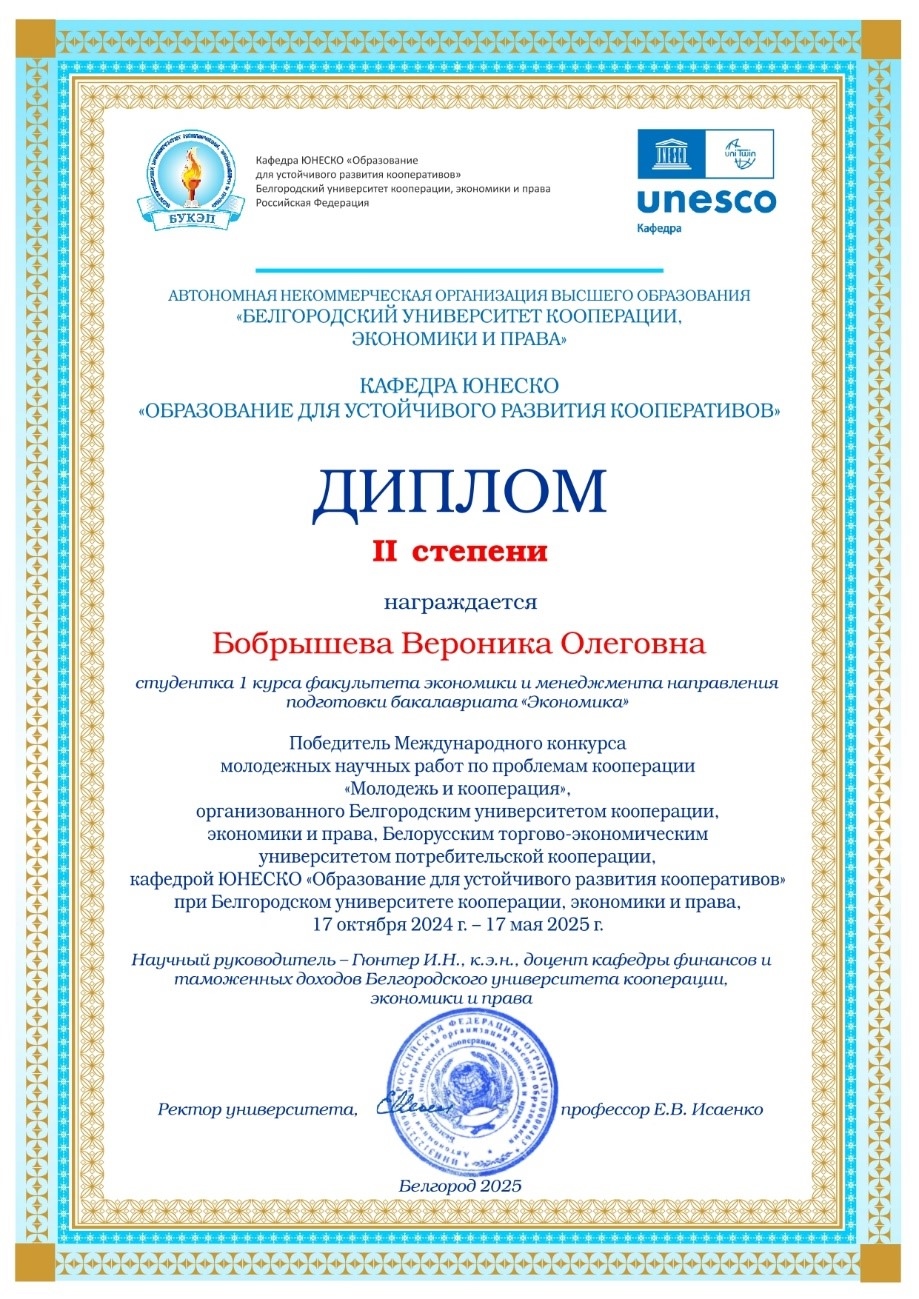 По итогам конкурса дипломом II степени была удостоена научная работа студентки Вероники Олеговны Бобрышевой на тему «Особенности развития общественного питания и заготовительной деятельности в потребительской кооперации». Научным руководителем конкурсантки являлась к.э.н., доцент кафедры финансов и таможенных доходов Ирина Николаевна Гюнтер.