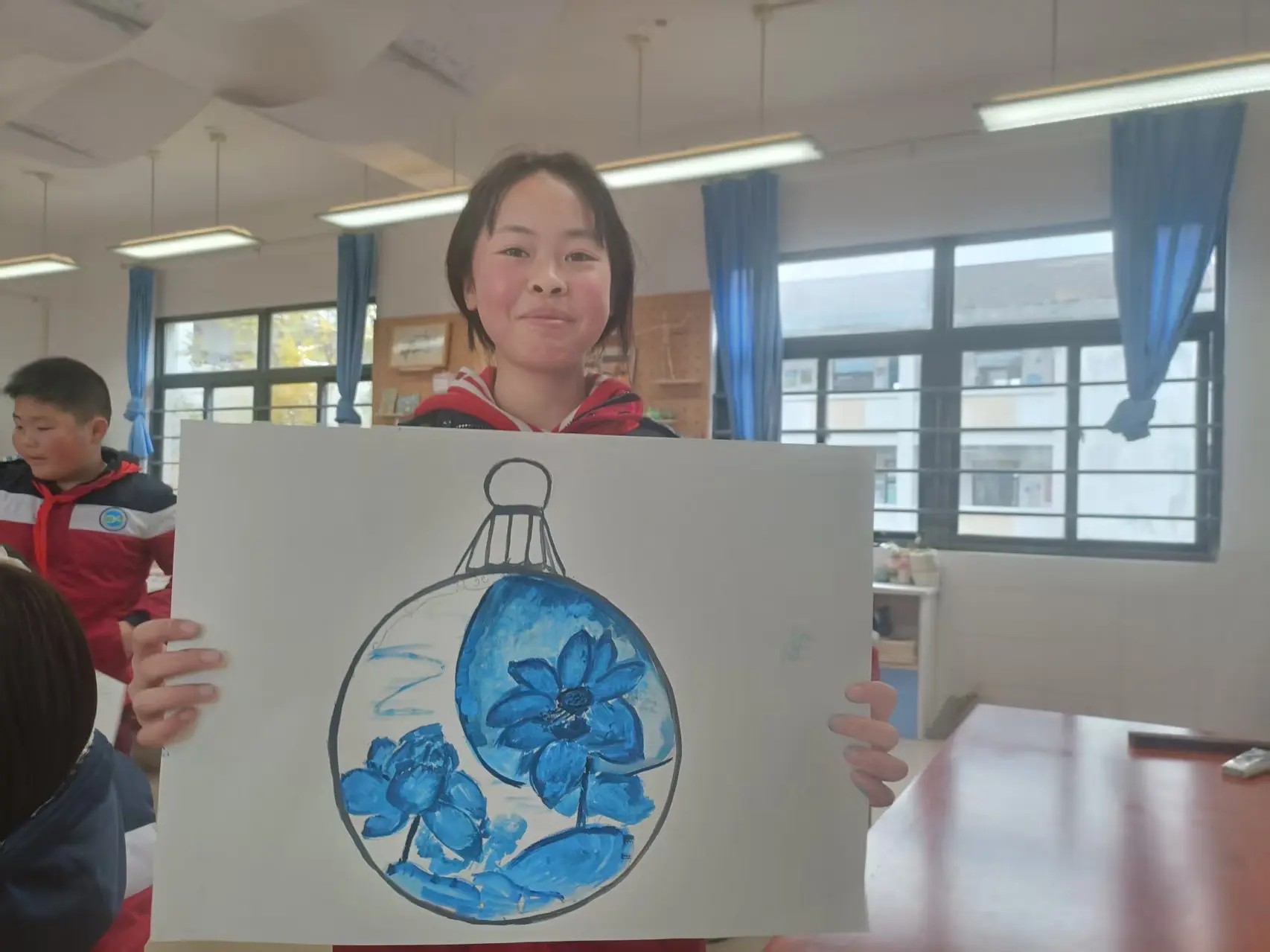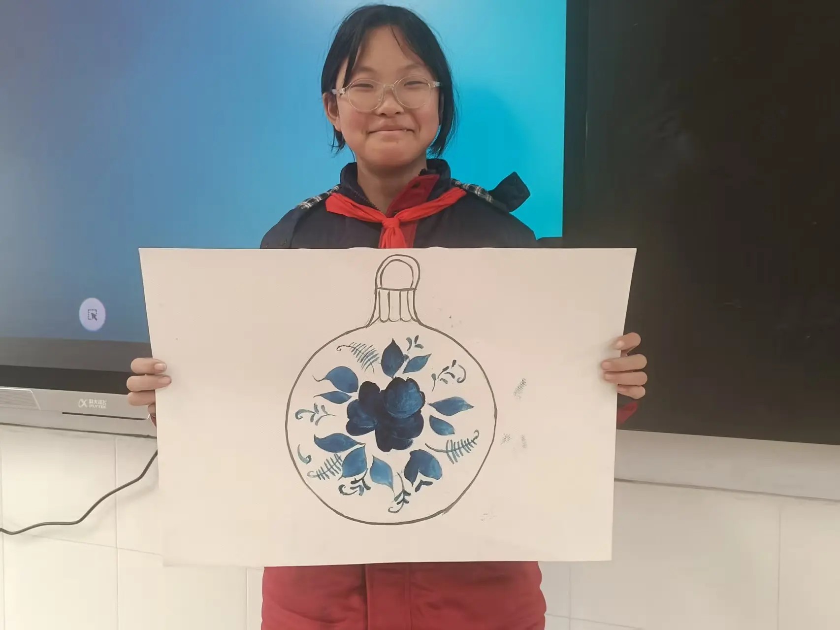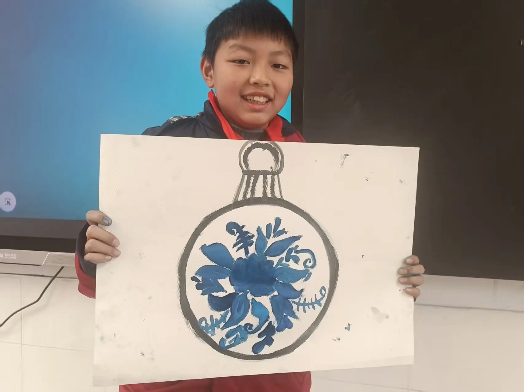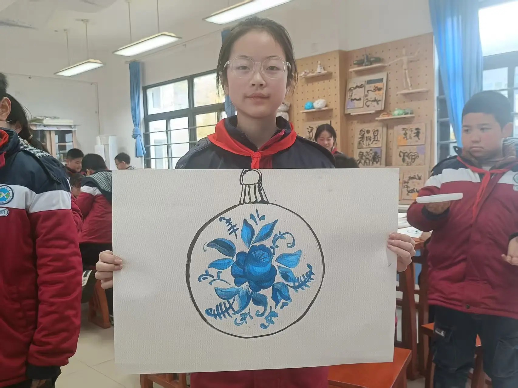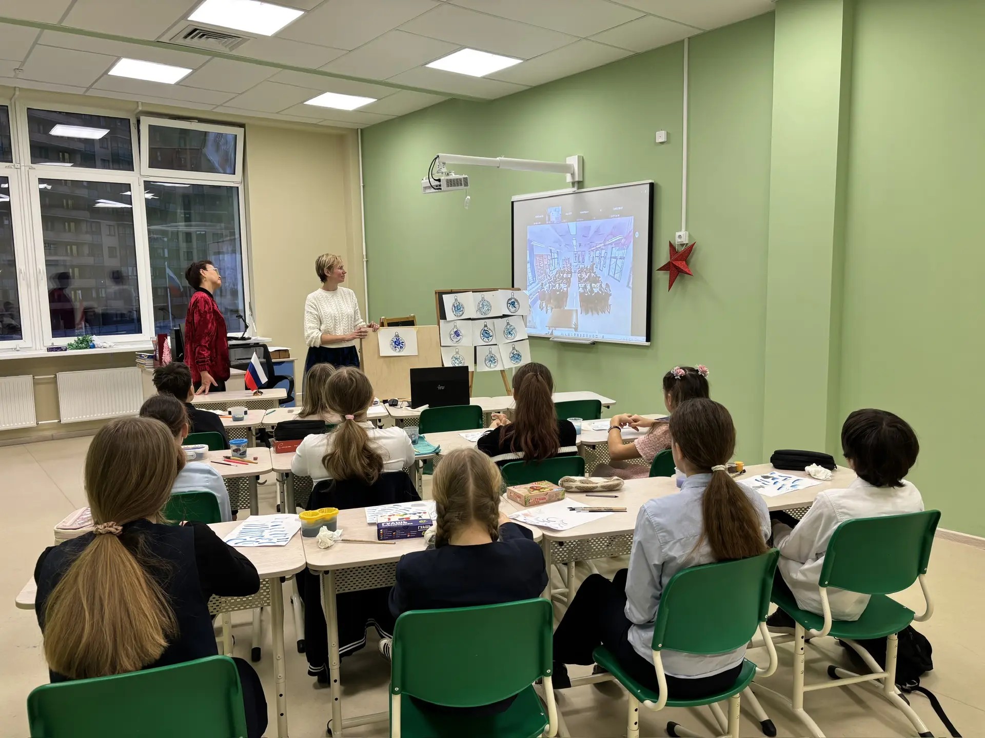 На уроке ребята из Китая и России вместе изготовили елочный шар в стиле «гжель».