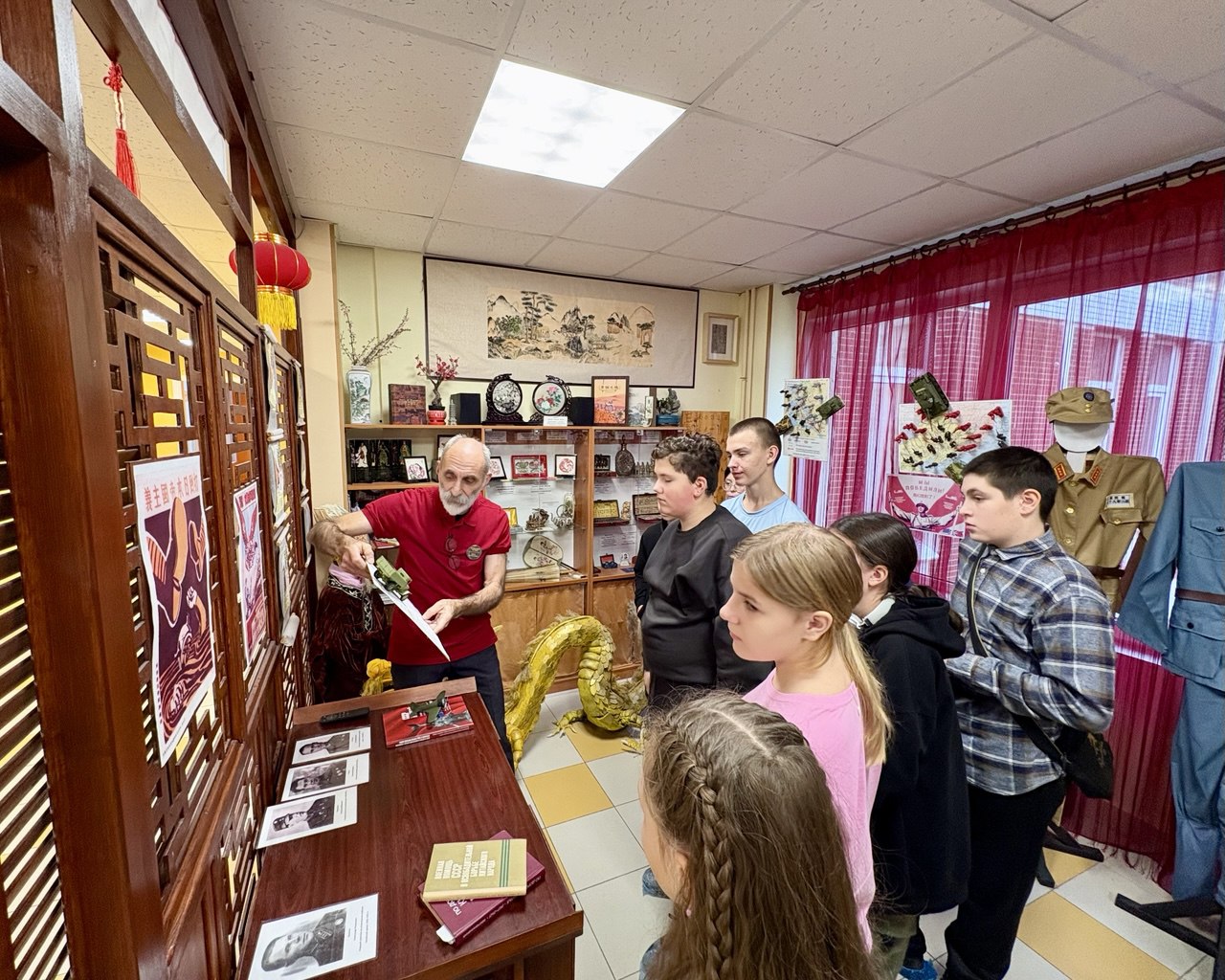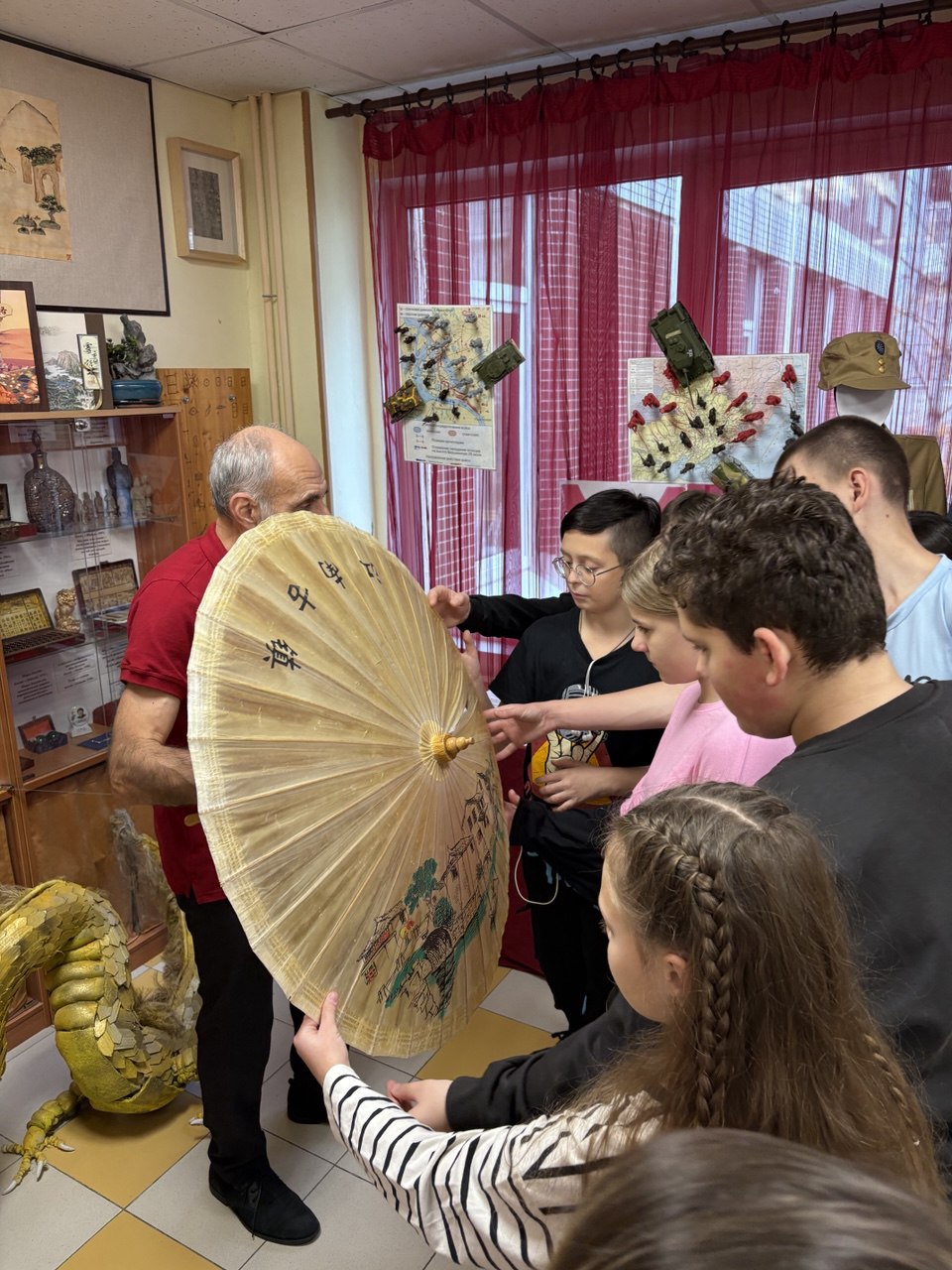 Эта невероятно ценная коллекция — настоящий мост дружбы между детьми двух стран. Ребята с большим интересом рассматривали традиционные китайские веера и вышивку, знакомились с искусством каллиграфии и слушали истории о каждом экспонате.