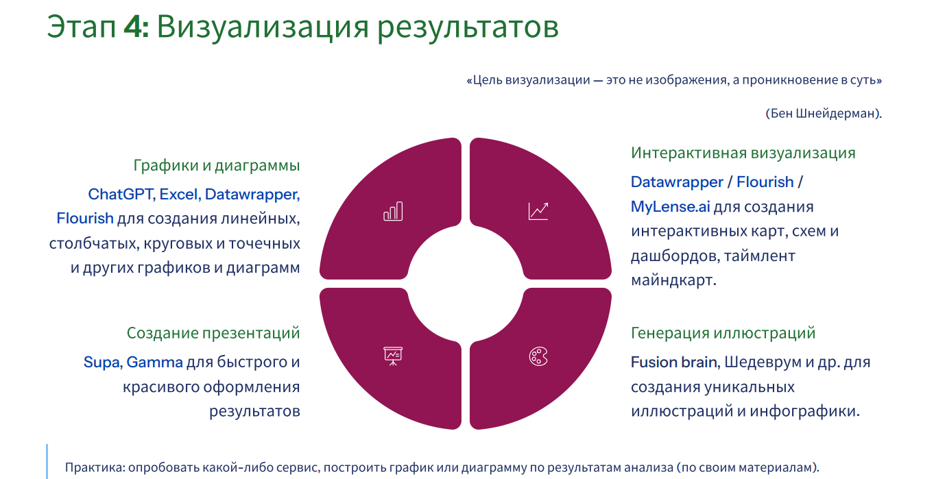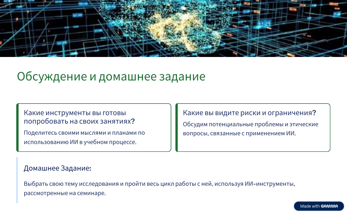 Речь на семинаре шла о том, как превратить искусственный интеллект из модного тренда в эффективного помощника и даже - «цифрового лаборанта» на разных этапах научной работы. В ходе семинара участники обсуждали, как с помощью различных инструментов искусственного интеллекта можно эффективно спланировать исследование выбранной темы, осуществить сбор и анализ данных, какие инструменты использовать для визуализации данных и представления результатов своего исследования общественности.
