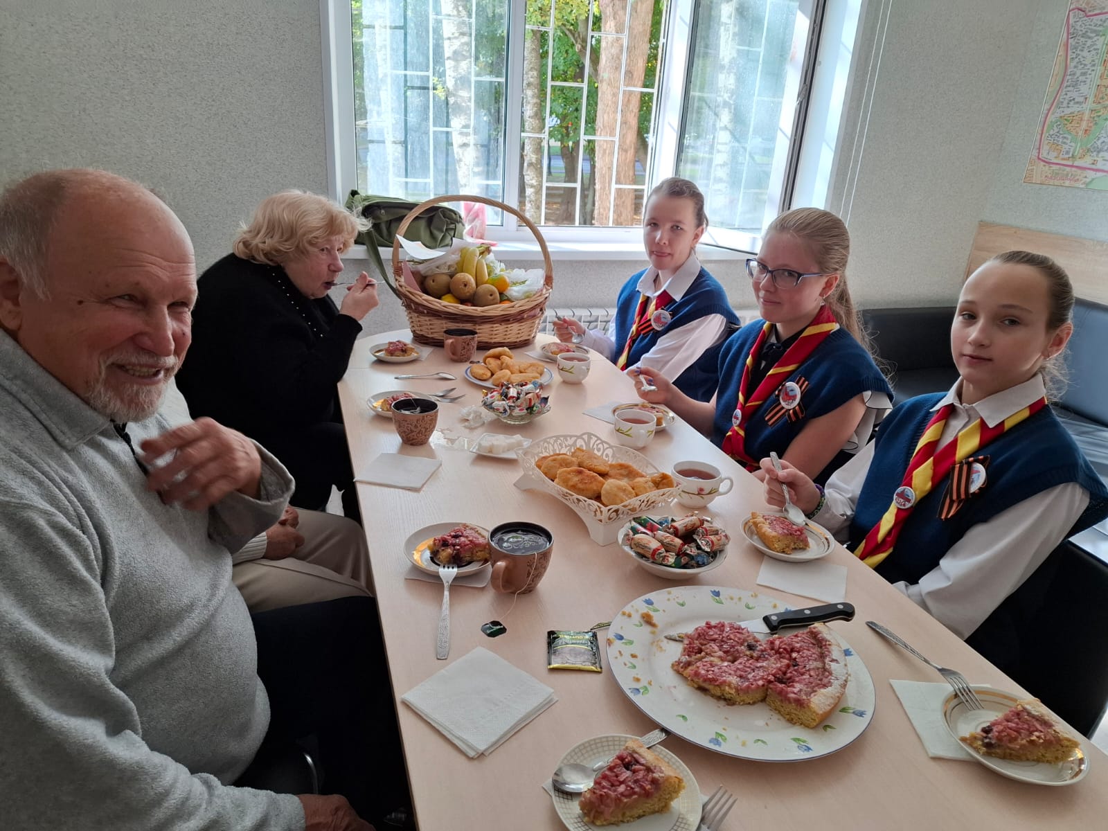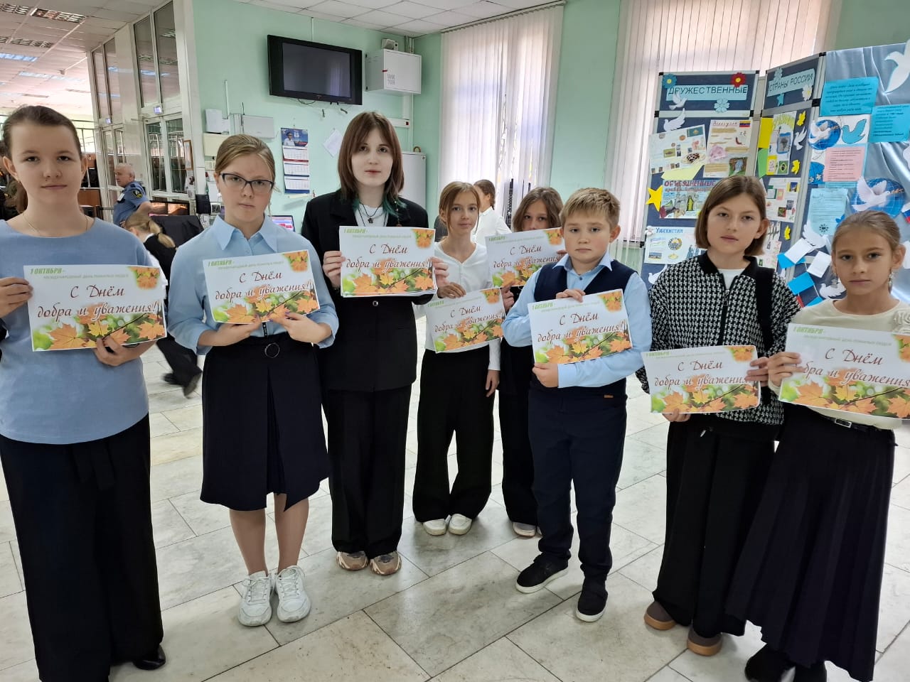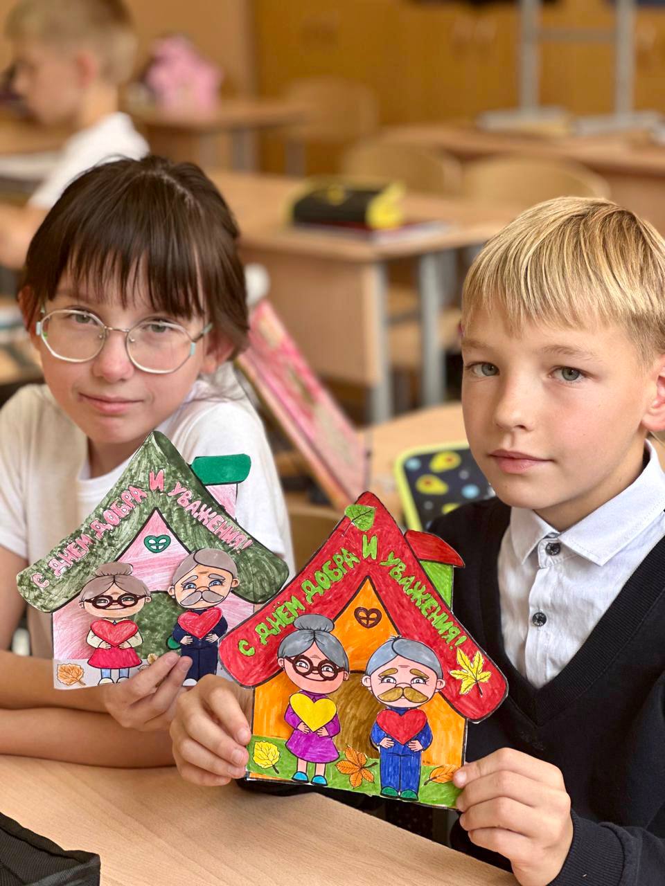 Ребята подготовили поздравительные плакаты и разместили их на информационных стендах и в подъездах своих домов. Представители клуба «Рубеж» побывали в Совете первичной ветеранской организации №1 района Отрадное, где выступили с поэтическим поздравлением, вручили корзину фруктов с пожеланиями здоровья, оптимизма, отличного настроения. Члены Совета испекли ягодный пирог и пирожки, угостили ребят чаем. За столом состоялась веселая задушевная беседа, в которой ребята много узнали об интересных моментах жизни людей старшего поколения, ответили на многочисленные вопросы, услышали слова благодарности за внимание и пожелания отличной учебы. К ученикам начальных классов пришли всеми любимые персонажи: почтальон Печкин, кот Матроскин и пёс Шарик. Печкин рассказывал о своих пожилых друзьях, Матроскин делился историями о мудрых соседях из Простоквашино, а Шарик с восторгом вспоминал, как помогает бабушкам сторожить дома и охранять огороды от непрошенных гостей. Ребята поделились своими историями, сказали много правильных слов о заботе и внимании к людям старшего поколения, отгадали загадки, а также поиграли в увлекательную игру «Моя семья». В старших группах дошкольных отделений прошли беседы о том, что значит этот день, кто такие пожилые люди и как мы можем проявлять заботу о них. Дети с особым старанием сделали открытки для своих любимых бабушек и дедушек. В средних группах ребята участвовали в разговоре на тему «Мои любимые бабушки и дедушки». Дети с радостью делились историями о том, как их любят и балуют старшие, и подарили бабушкам и дедушкам сделанные своими руками сувениры. Была оформлена фотовыставка «Бабушки и дедушки бывают разные». Ребята делились историями о близких, вспоминали их мудрые советы и добрые поступки. Ученики 1–4 классов своими руками сделали праздничные открытки и вручили их старшему поколению — в каждом маленьком рисунке и слове чувствовалась искренняя забота. А бабушки и дедушки поделились семейными фотографиями, из которых ребята создали яркий фотоколлаж «Здоровье в порядке - спасибо грядке!». День получился по-настоящему тёплым: море улыбок, слова благодарности и ощущение большой дружной семьи, где ценят опыт и мудрость старших.