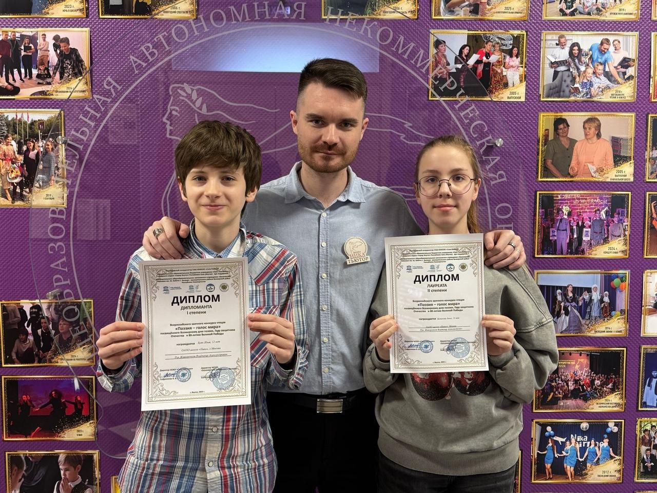 Илья Б. и Анна Б., ученики 6"Д" класса, доказали, что поэзия – это не просто строки, а настоящий голос души. Ребята блестяще выступили на Всероссийском конкурсе "Поэзия – голос мира", посвященном Году защитника Отечества и 80-летию Великой Победы.
