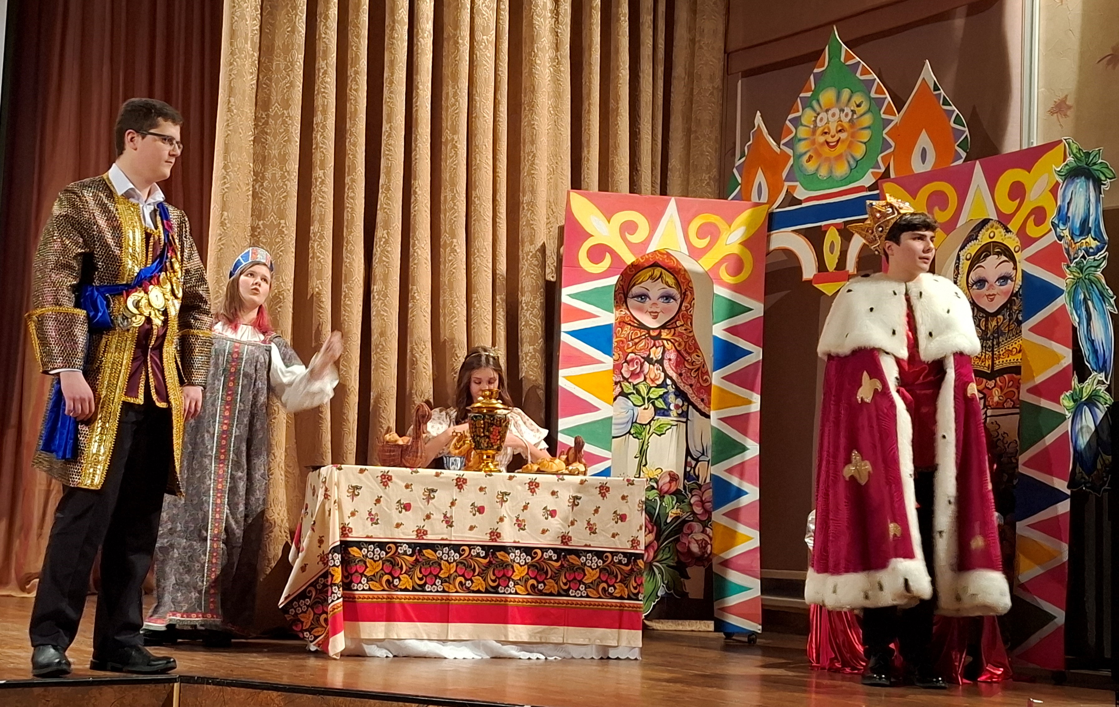 Для учащихся 9-11 классов, родителей, педагогов, выпускников школы состоялась премьера спектакля «Летучий корабль. В добрый путь или за счастьем на седьмое небо», который представили учащиеся десятых классов. Две современные школьницы шли по лесу, потерялись и …оказались в сказке. Благородный Водяной и Кикиморы рассказали им историю, которая произошла давным- давно. Во дворце Царь не может решить, как наполнить казну. Старшая дочь Евлампия обновки требует и аппетиты поумерить не желает. Всем известно, что царским дочкам замуж выходить нужно «по расчету». Вот и решил Царь выдать свою младшую дочь царевну Забаву за богатого боярина Полкана. Только царевна Забава понимает, что счастья без любви не бывает, и хочет выйти замуж по любви за трубочиста Ваню - симпатичного и смекалистого парня, который ради царской дочери готов совершить самый невероятный подвиг. Теперь у Ивана цель - создать ради своей возлюбленной Летучий корабль, которого никогда ни у кого не было. Отправился Иван в дальнюю дорогу, за тёмными лесами, в зыбучих болотах встретился он с «нечистой силой»! И помог Ивану построить Летучий корабль сам Водяной, но это полдела. Чтобы корабль взлетел, к Бабкам-Ёжкам надо идти за заветными словами, а они и съесть могут. Но в сказке, как и в жизни, настоящая любовь побеждает все непреодолимые препятствия! В красочном музыкальном спектакле учащихся 10-х классов (классные руководители, режиссер-постановщики Королева Е.А., Бушуева Е.И., Грязнова Л.М.) зрители увидели прекрасные актерские работы, режиссерские находки, зажигательные и романтические танцы (постановщик Буравлева М.А.). Получился очень динамичный, яркий спектакль. Зрители восторженно встречали полюбившихся героев, наградили актеров и создателей спектакля заслуженными аплодисментами и долго не отпускали со сцены.