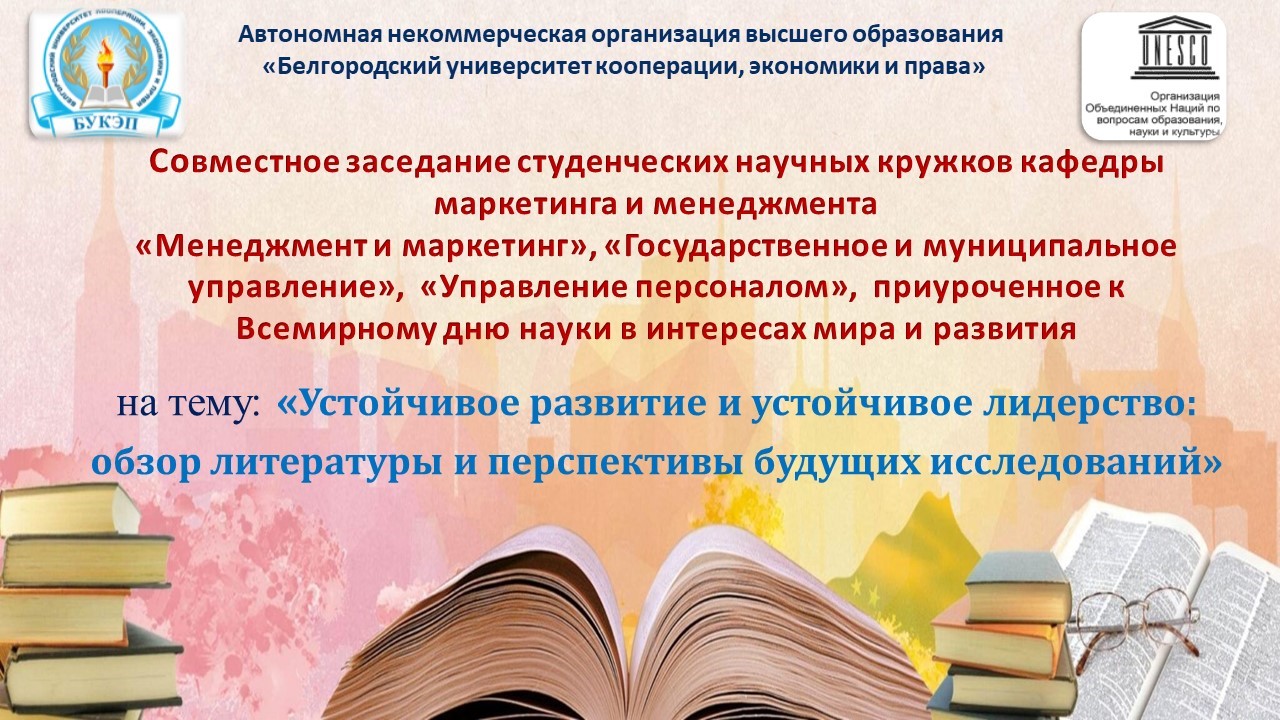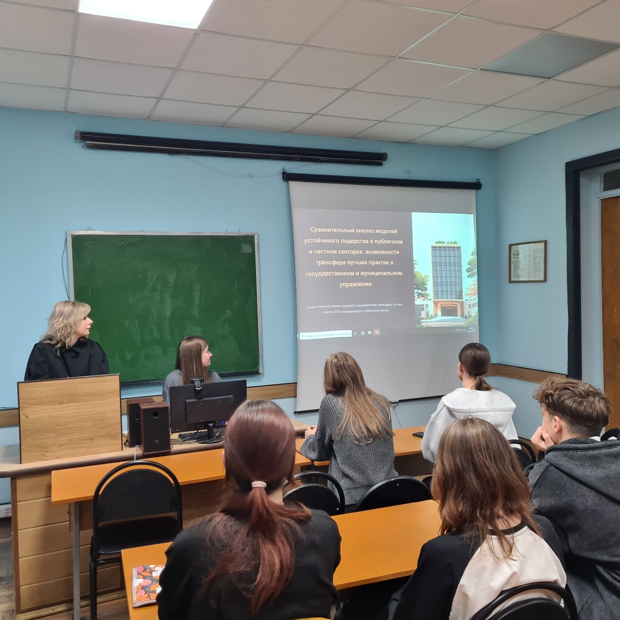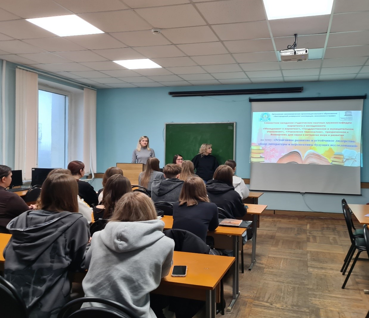 13 ноября 2025 года было проведено совместное заседания студенческих научных кружков кафедры маркетинга и менеджмента «Менеджмент и маркетинг» (руководитель ст. преп. Болотова И.С.), «Государственное и муниципальное управление» (руководитель доц. Ледовская И.И.), «Управление персоналом» (руководитель доц. Скрипченко Т.Л.) на тему «Устойчивое развитие и устойчивое лидерство: обзор литературы и перспективы будущих исследований».