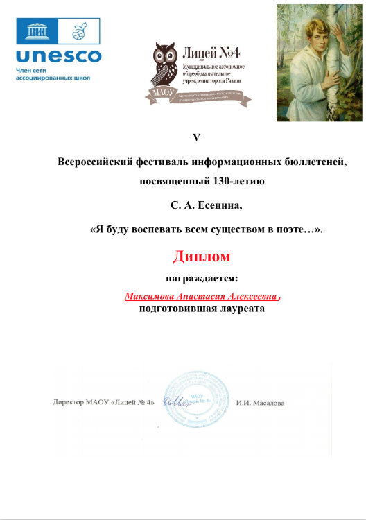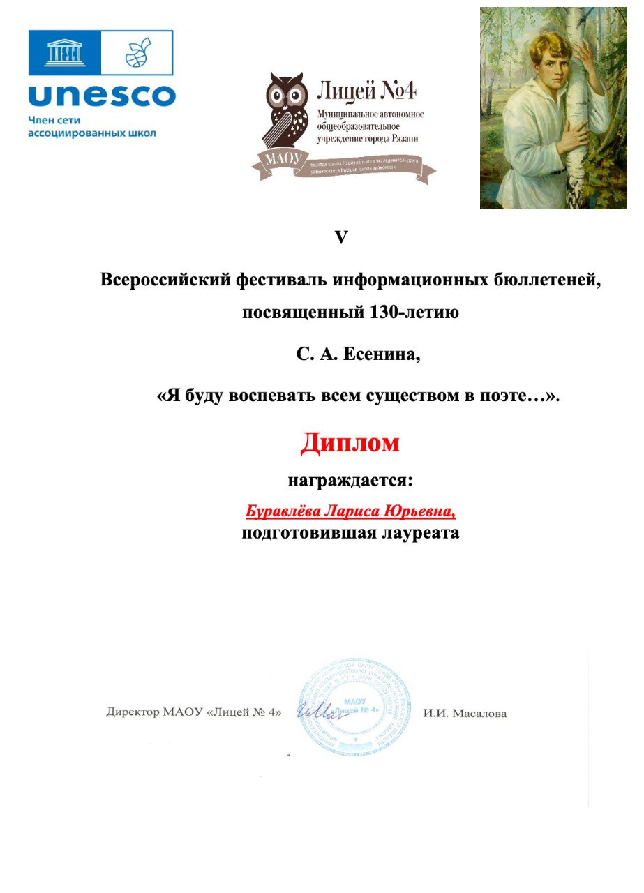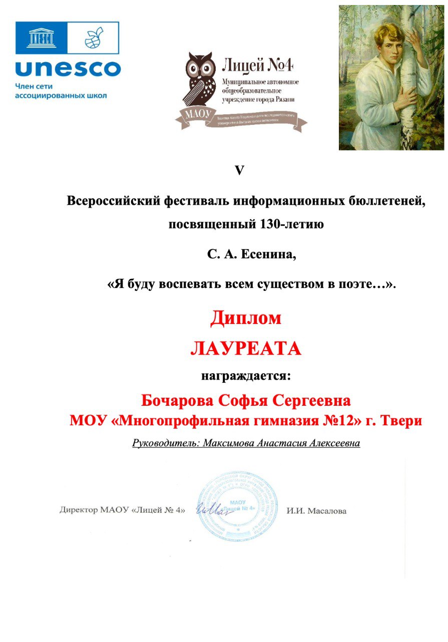 Ученики гимназии №12 г. Твери стали лауреатами V Всероссийского фестиваля информационных бюллетеней, посвящённого 130-летию С. А. Есенина