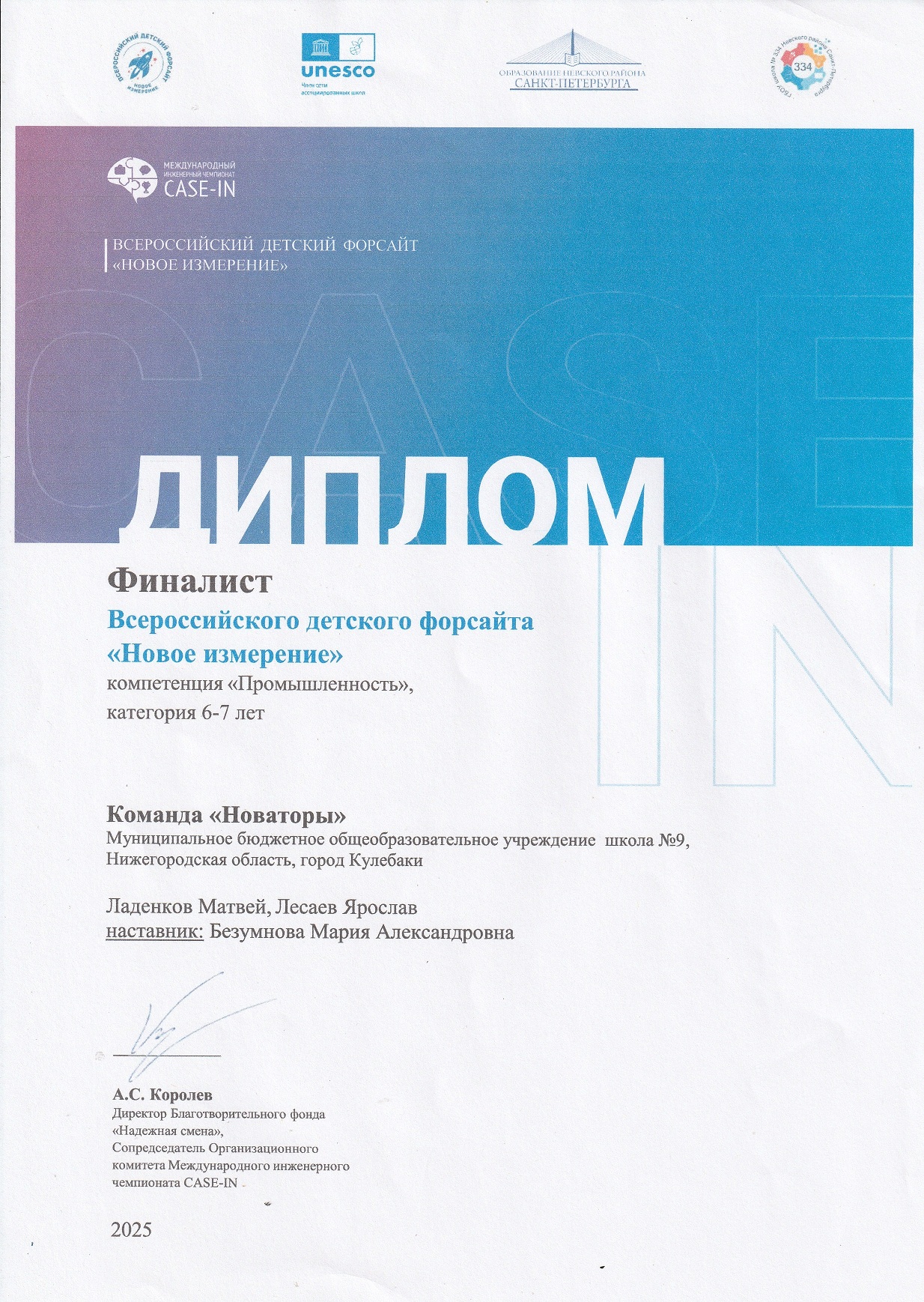 В данном масштабном событии приняла участие команда юных учащихся МБОУ школы №9 города Кулебаки «Новаторы». Первоклассники Матвей Ладенков и Ярослав Лесаев под руководством учителя начальных классов Марии Александровны Безумновой создали робототехническое устройство и стали финалистами детского форсайта «Новое измерение» в компетенции «Промышленность».