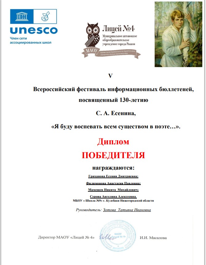 Ассоциированная школа ЮНЕСКО МБОУ школа №9 города Кулебаки Нижегородской области приняла участие в V Всероссийском фестивале информационных бюллетеней "Я буду воспевать всем существом в поэте...", посвященном 130-летию С.А. Есенина.