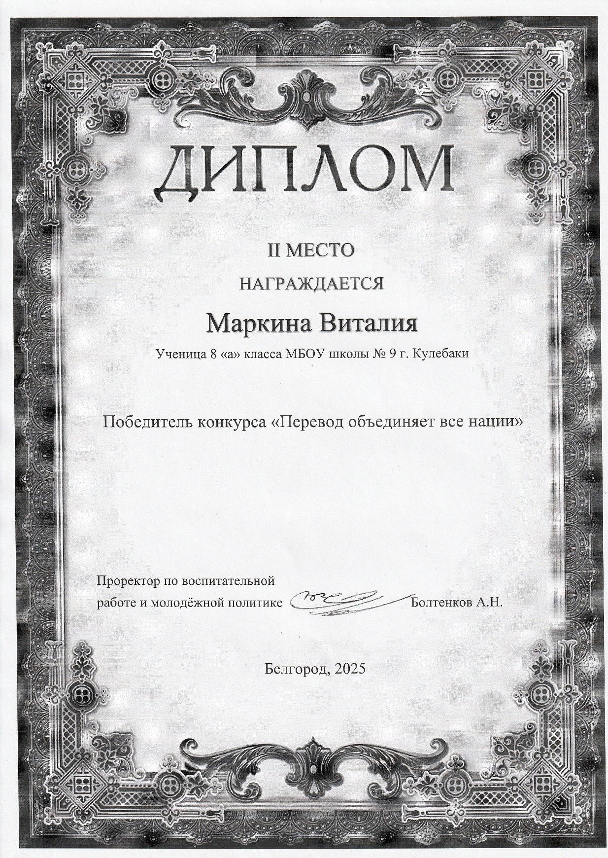 Обучающиеся 8А класса МБОУ школы №9 города Кулебаки Виталия Маркина и Элина Куликова приняли участие в данном конкурсном испытании. Отрадно отметить, что Виталия Маркина стала призером Всероссийского конкурса и заняла 2 место.