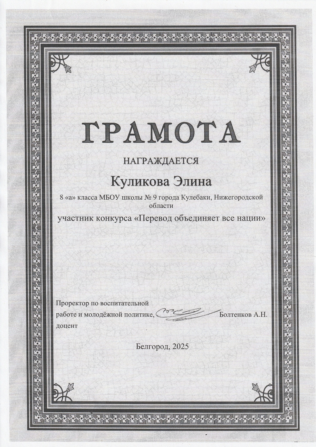 Ассоциированная школа ЮНЕСКО МБОУ школа №9 грода Кулебаки Нижегородской области приняла участие во Всероссийском конкурсе по английскому языку "Перевод объединяет все нации".