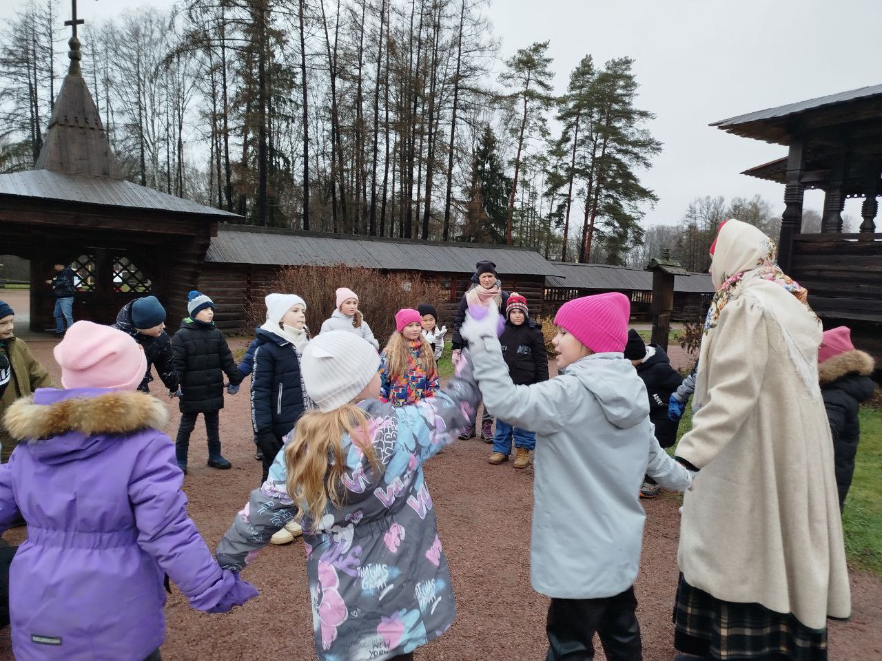 Под открытым небом раскинулся удивительный музей деревянного зодчества – дома, часовни, церковь, хозяйственные постройки! Гуляя по этнопарку, выполняя задания, хранящие в себе корни фольклорных историй, разучивая игры народов северных земель, хороводы, калядки – оказались мы на подворье Деда Мороза. А Дедушка Мороз провёл в свою горницу, одарил подарками в стиле деревянного зодчества и пожелал счастливого нового года.