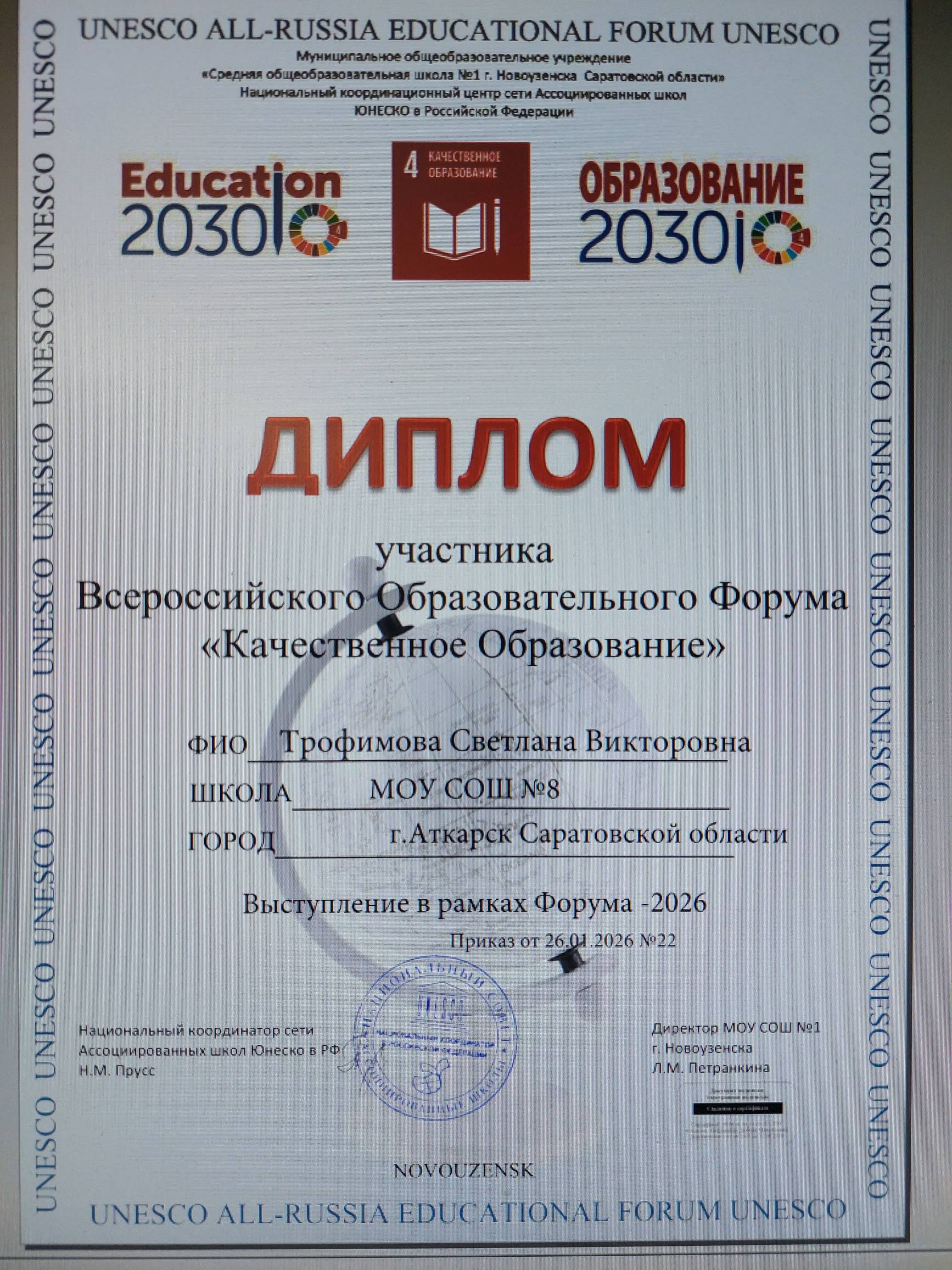 Трофимова Светлана Викторовна выступила с докладом на Всероссийском Образовательном Форуме «Качественное образование», который был организован и проведён Ассоциированной школой ЮНЕСКО СОШ № 1 г. Новоузенска Саратовской области.